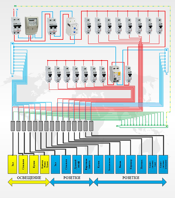 Как было сказано выше, основное требование современной схемы электропроводки – это распределение нагрузок в сети по группам потребителей. С освещением все просто, потому что современный подход к экономии электроэнергии создал условия, при которых нагрузка на освещение очень мала ввиду использования в квартирах энергосберегающих источников света.