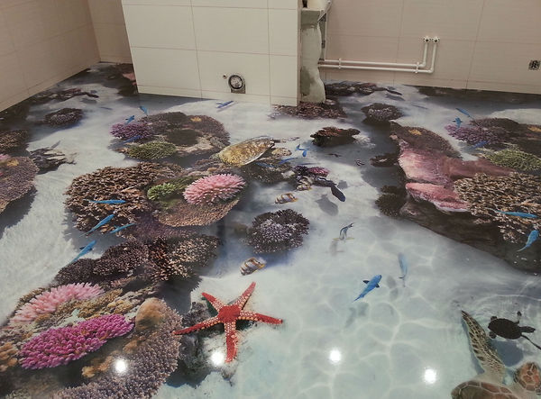 Наливные декоративные полы – это новые напольные покрытия, разработанные сравнительно недавно. Изготавливаются наливные полы из полимеров, созданных на основе эпоксидных смол, и в большинстве случаев натурального в них ничего нет. Но этот недостаток с лихвой окупается внешним видом и характеристиками этого покрытия для пола – они не бьются и даже не царапаются и кроме того могут иметь уникальный внешний вид. Они представляют собой не паханое поле для дизайнеров – с помощью наливных технологий можно создать на полу любое объемное изображение, о реалистичного которого спорить не приходится. Под верхний полимерный слой закладывается пленка с 3-d фотопечатью, которая и создает уникальные эффекты.