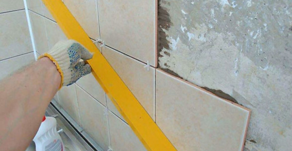 Правильность укладки кафельной плитки проверяется с помощью уровня.