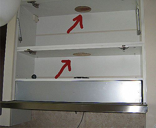 Вытяжки, имеющие для крепления угловую планку, встраиваются внутрь подвесной мебели (шкафа). Для этого в шкафу необходимо проделать отверстие нужного диаметра для того, чтобы вывести воздуховод.
